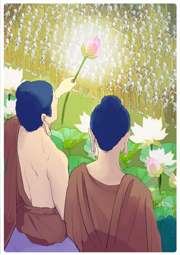 仏 世尊に 獅子座の半分を譲って