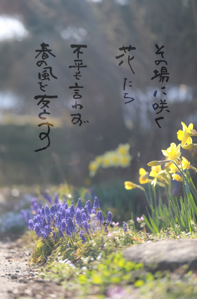 その場に咲く花たち 不平も言わず春の風を友とす